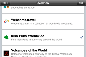 Net als de Layar Reality Browser, vult ook Wikitude World Browser wat je ziet aan met zinvolle informatie. Wat Layar 'Layers' of lagen noemt, noemt Wikitude 'Worlds'. Deze filters zijn gekoppeld aan POI's, ofwel points of interest. Je zet de gewenste filters aan en uit met een druk op de knop (reset).